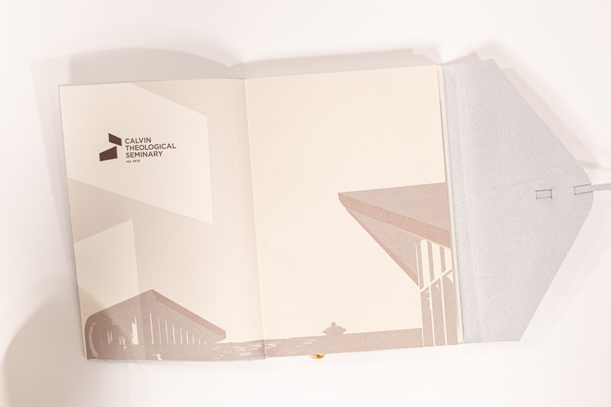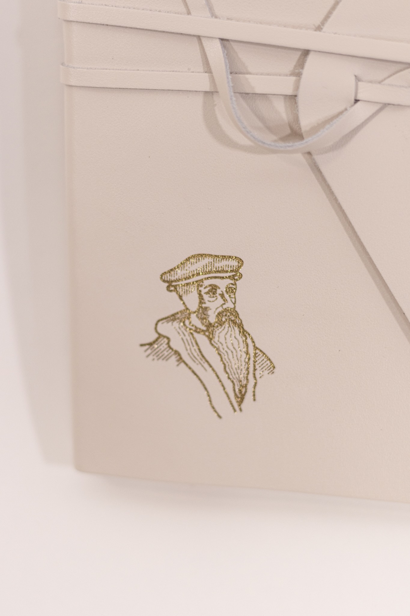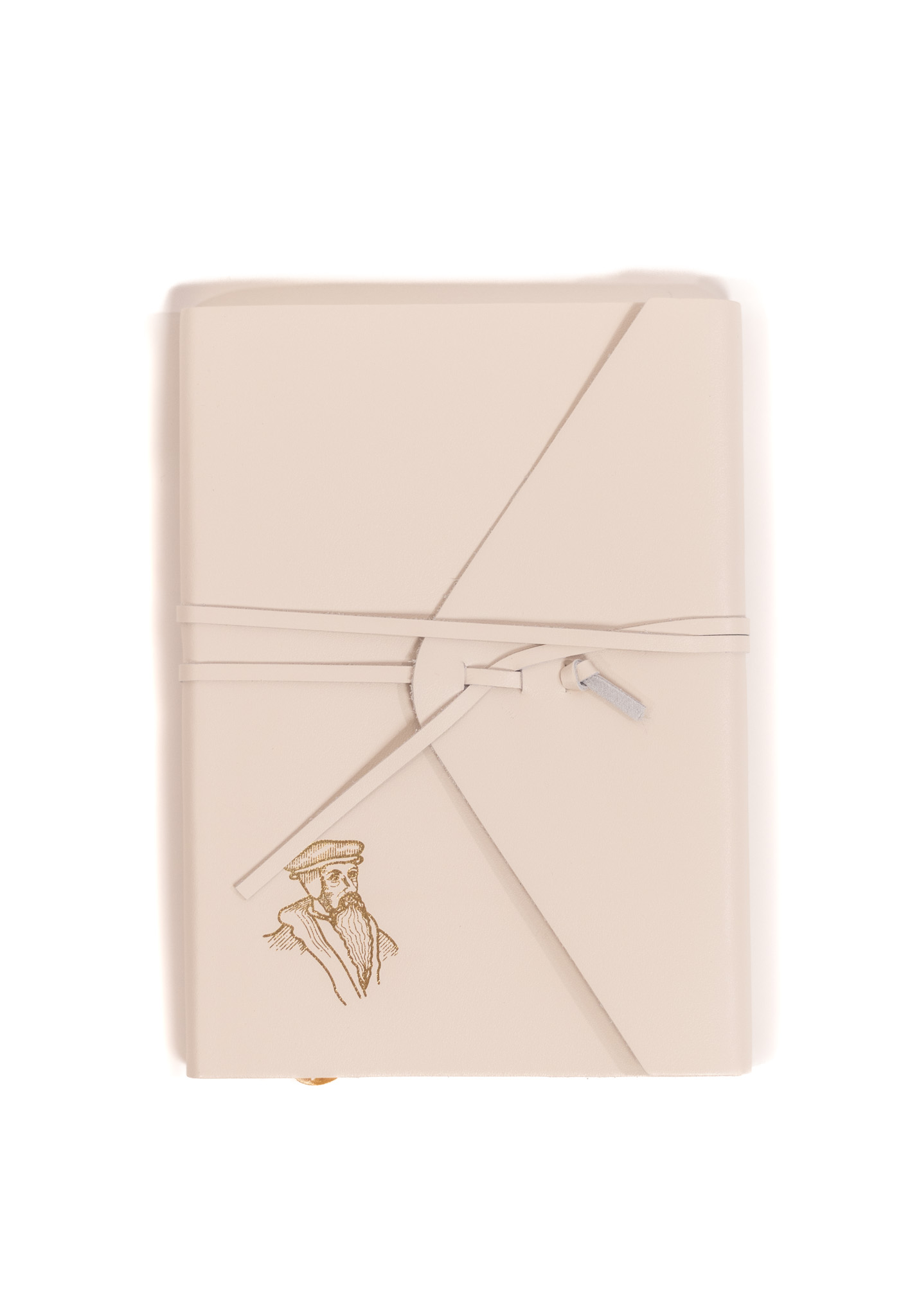 Stay organized in style with this premium notebook, featuring a 5.8 × 8.3-inch wraparound design, squared corners, and 128 dotted ivory pages (90gsm) with partial printed accents. Genuine leather cover with a gold foiled John Calvin, and a convenient ribbon marker for easy reference.